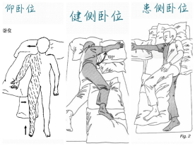 1、良姿位擺放仰臥位時,患者雙側(cè)肩關(guān)節(jié)固定于枕頭上,防止肩關(guān)節(jié)后縮,患側(cè)上肢與軀干保持一定夾角(大于45度),將上肢放在軟墊上。健側(cè)臥位時,軀干略微前傾,患側(cè)肩關(guān)節(jié)向前平伸,上肢放在枕頭上,和軀干呈100度角。患側(cè)臥位時,軀干略微后仰,患側(cè)肩關(guān)節(jié)充分向前平伸內(nèi)旋,患側(cè)上肢與軀干呈90度角。